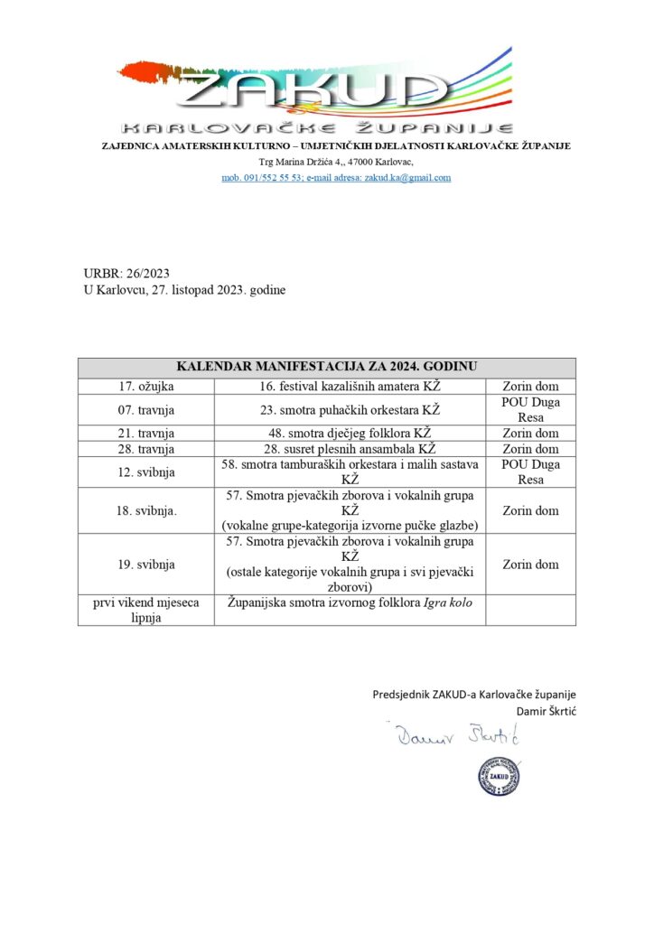 Upravni odbor ZAKUD-a Karlovačke županije je na svojoj III. sjednici, održanoj dana 19. listopada 2023. godine, donio Kalendar manifestacija županijskih smotri za 2024. godinu koji sadržava mjesto i vrijeme održavanja istih.