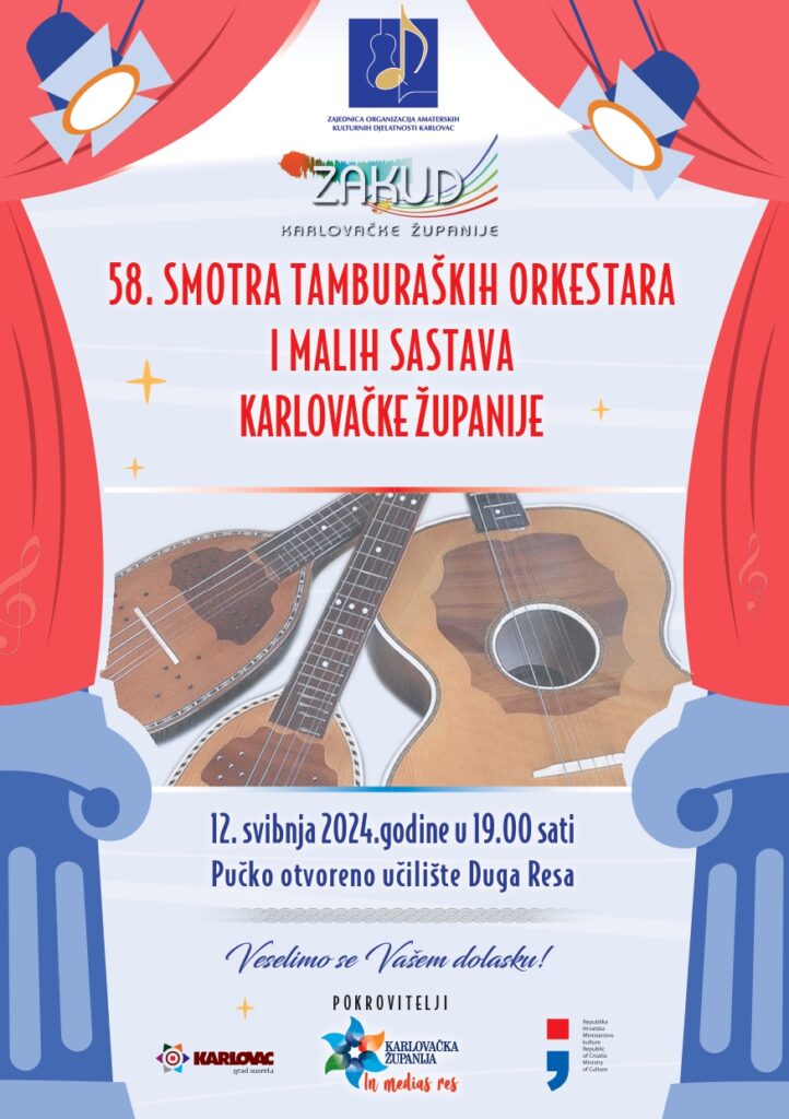 U nedjelju 12. svibnja, u Pučkom otvorenom učilištu Duga Resa održat će se 58. Smotra tamburaških orkestara i malih sastava Karlovačke županije s početkom u 19.00.