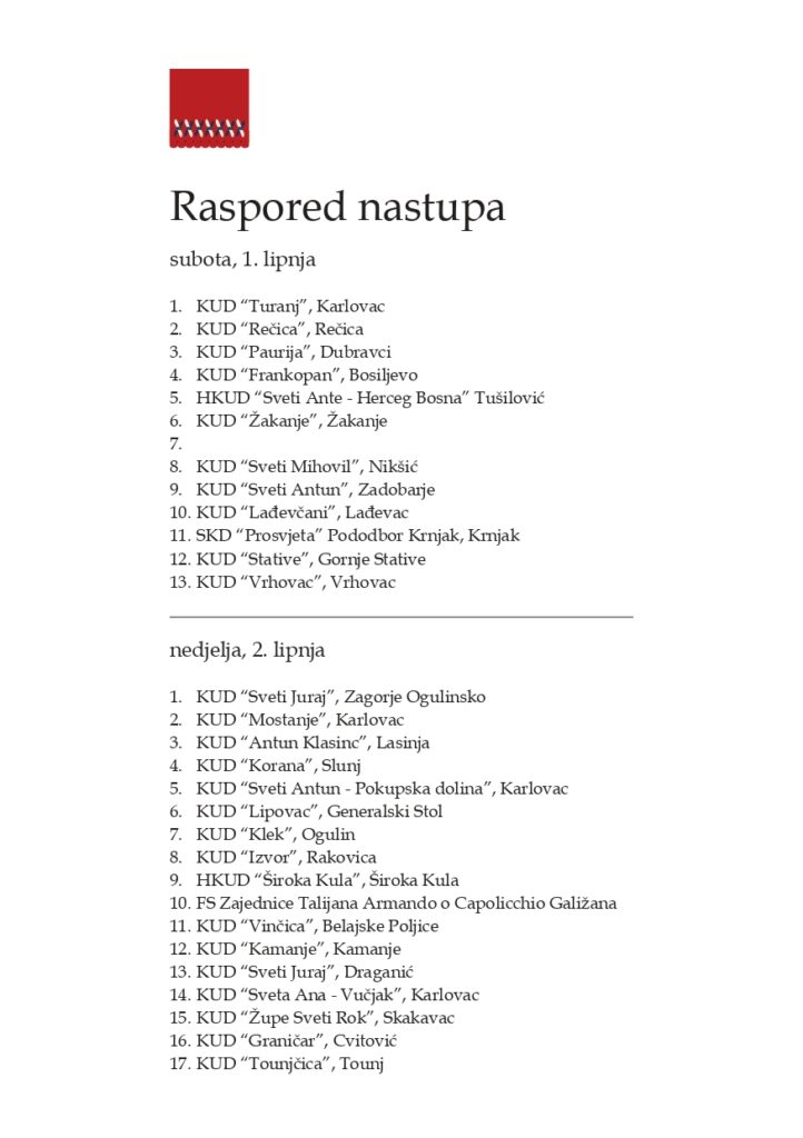 Na temelju Odluke s 3. sastanka Organizacijskog odbora Igra kolo, donesen je program 28. Smotre izvornog folklora Karlovačke županije Igra kolo i raspored glavnih nastupa: