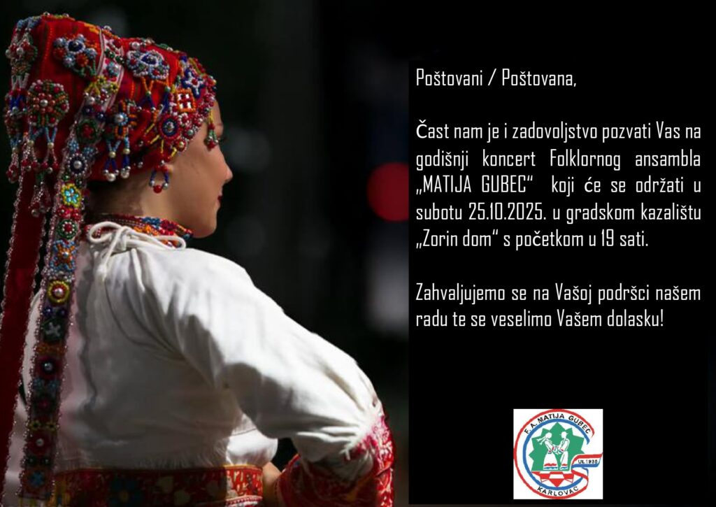 Folklorni ansambl „Matija Gubec“ organizira svoj svečani koncert koji će se održati u subotu, 25. listopada 2025. godine, u Gradskom kazalištu „Zorin dom“ s početkom u 19 sati.