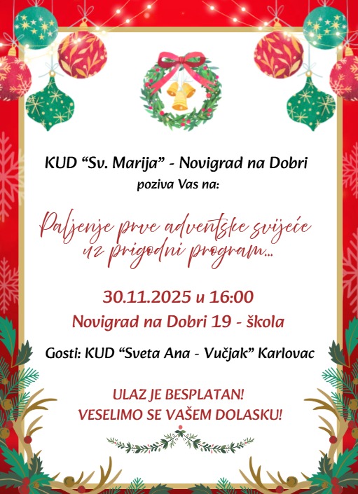 KUD „Sv. Marija“ – Novigrad na Dobri poziva sve mještane, goste i prijatelje na svečano paljenje prve adventske svijeće, uz prigodni program i druženje koje će označiti početak adventskog razdoblja u zajednici.